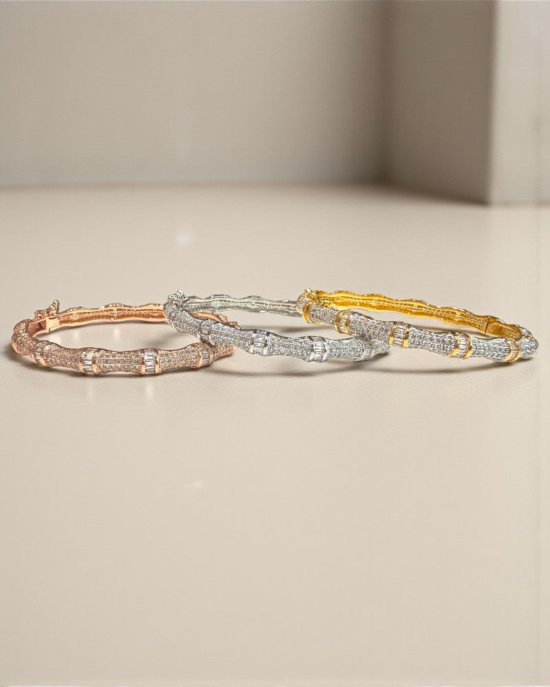 Inspired by the graceful curves of a serpent, these statement bangles are encrusted with shimmering micro-set stones, creating a dazzling wrap-around effect. Available in rose gold, silver, and classic gold finishes, this contemporary design blends bold elegance with everyday sophistication. Perfect for stacking or wearing solo for a refined statement.