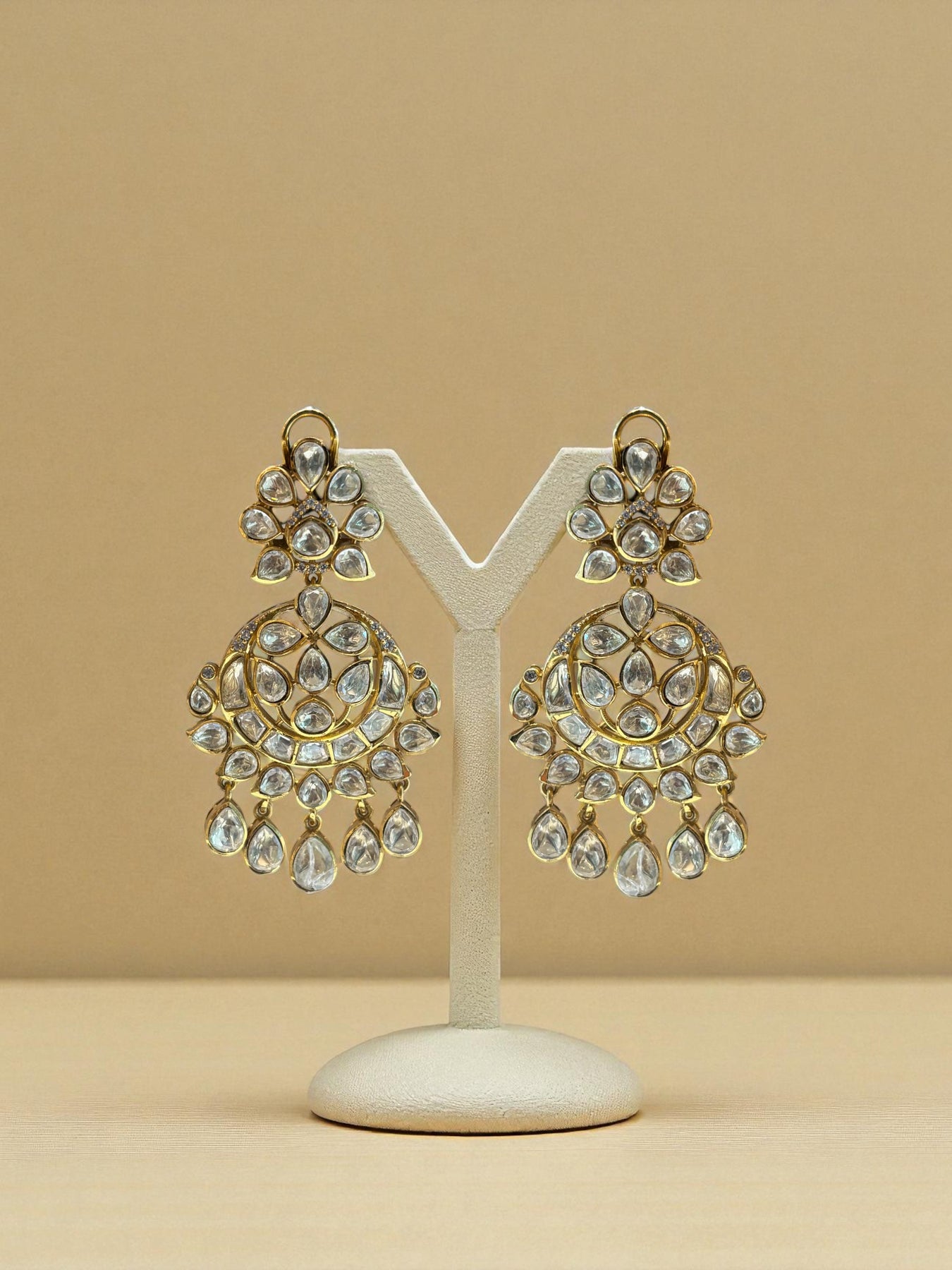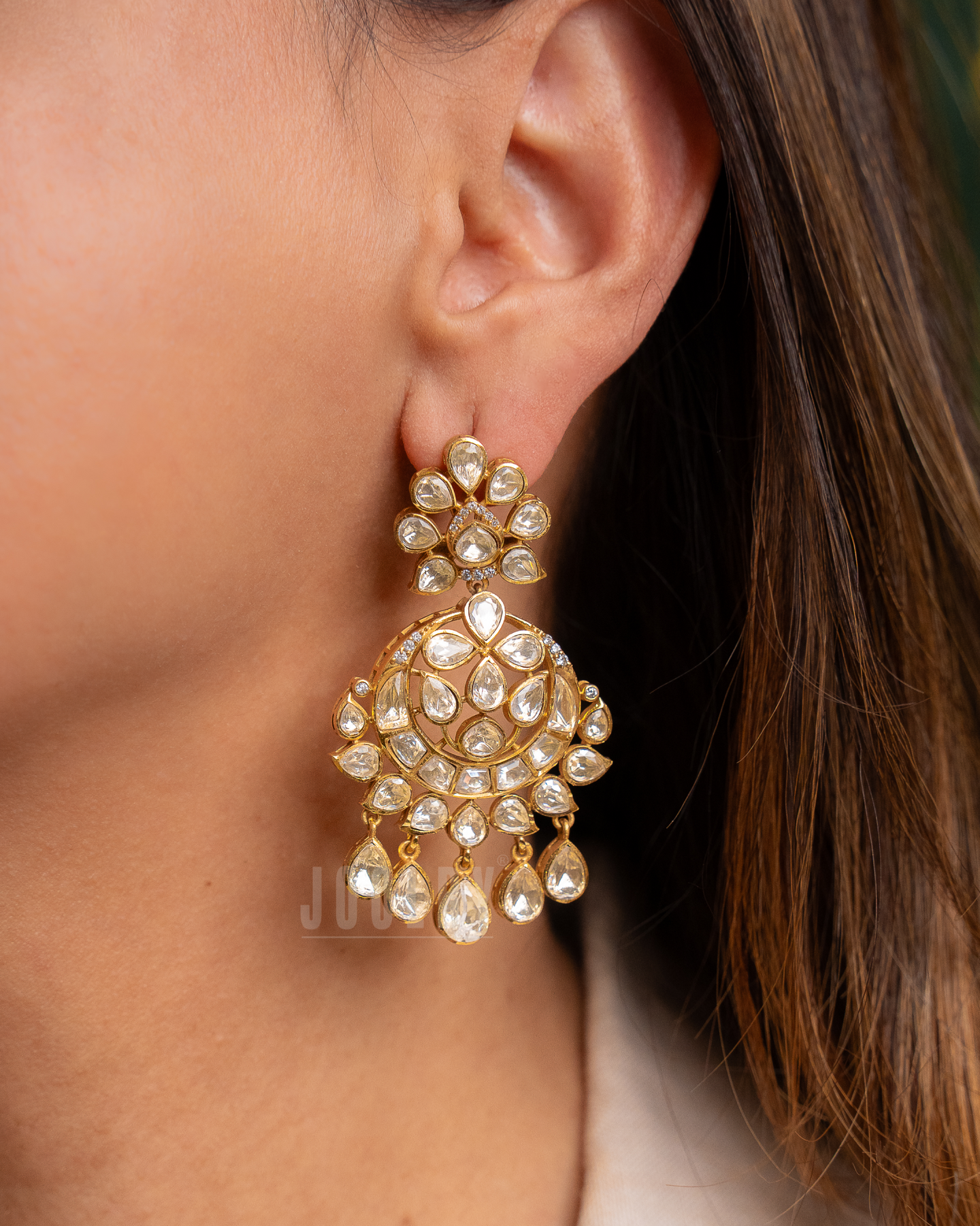 A timeless pair of chandbalis crafted with premium kundan stones set in a gold tone alloy. The layered crescent design, teardrop detailing, and delicate dangling drops create a graceful movement and radiant sparkle. Finished with anti tarnish plating, these earrings are perfect for weddings, festive occasions, or adding a regal touch to any ethnic outfit.