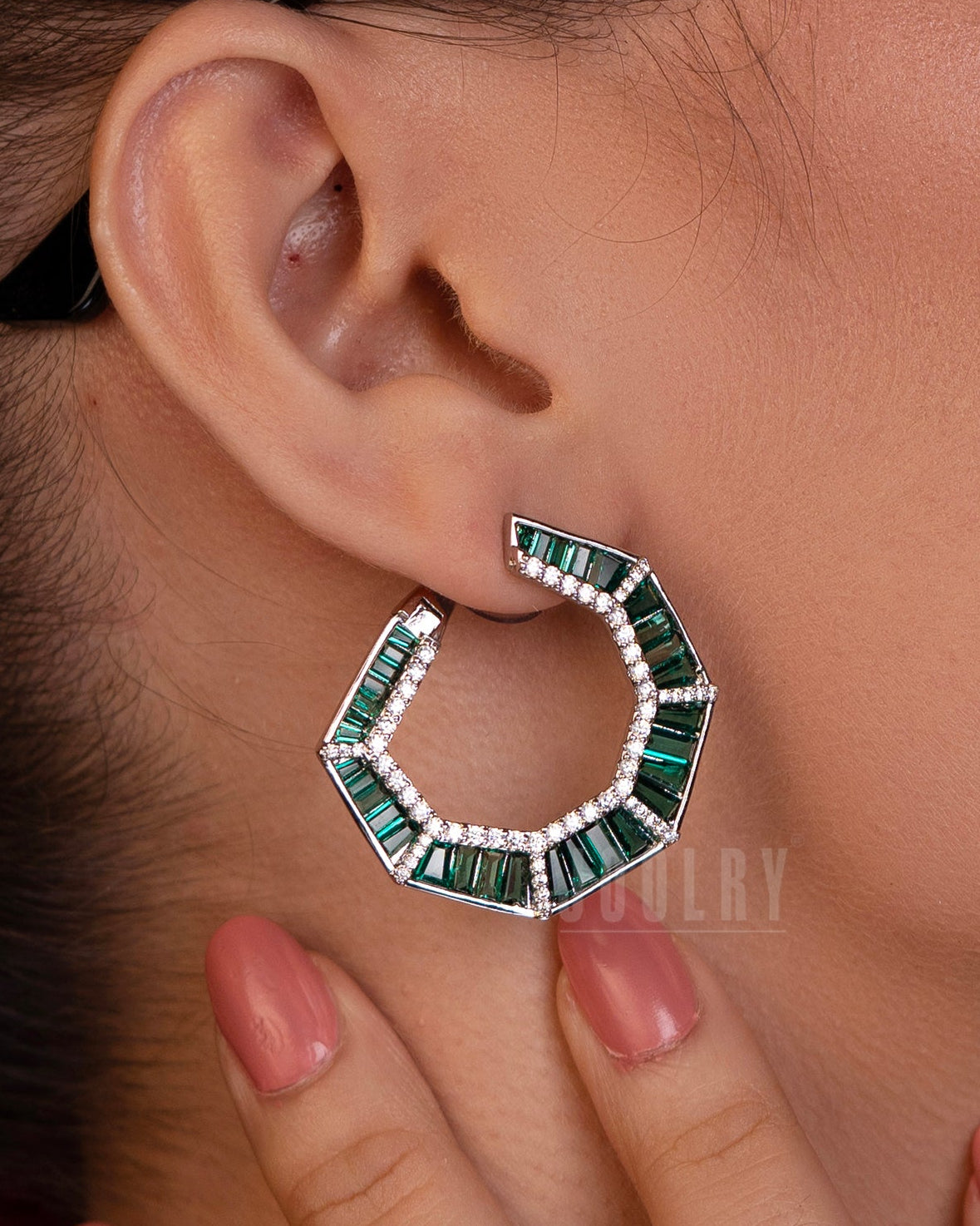 A chic pair of open hexagonal hoops adorned with baguette-cut green stones and sparkling cubic zirconia. Crafted in silver with alloy and finished with an anti-tarnish coating, these earrings bring a bold, modern twist to timeless elegance — perfect for contemporary style lovers.