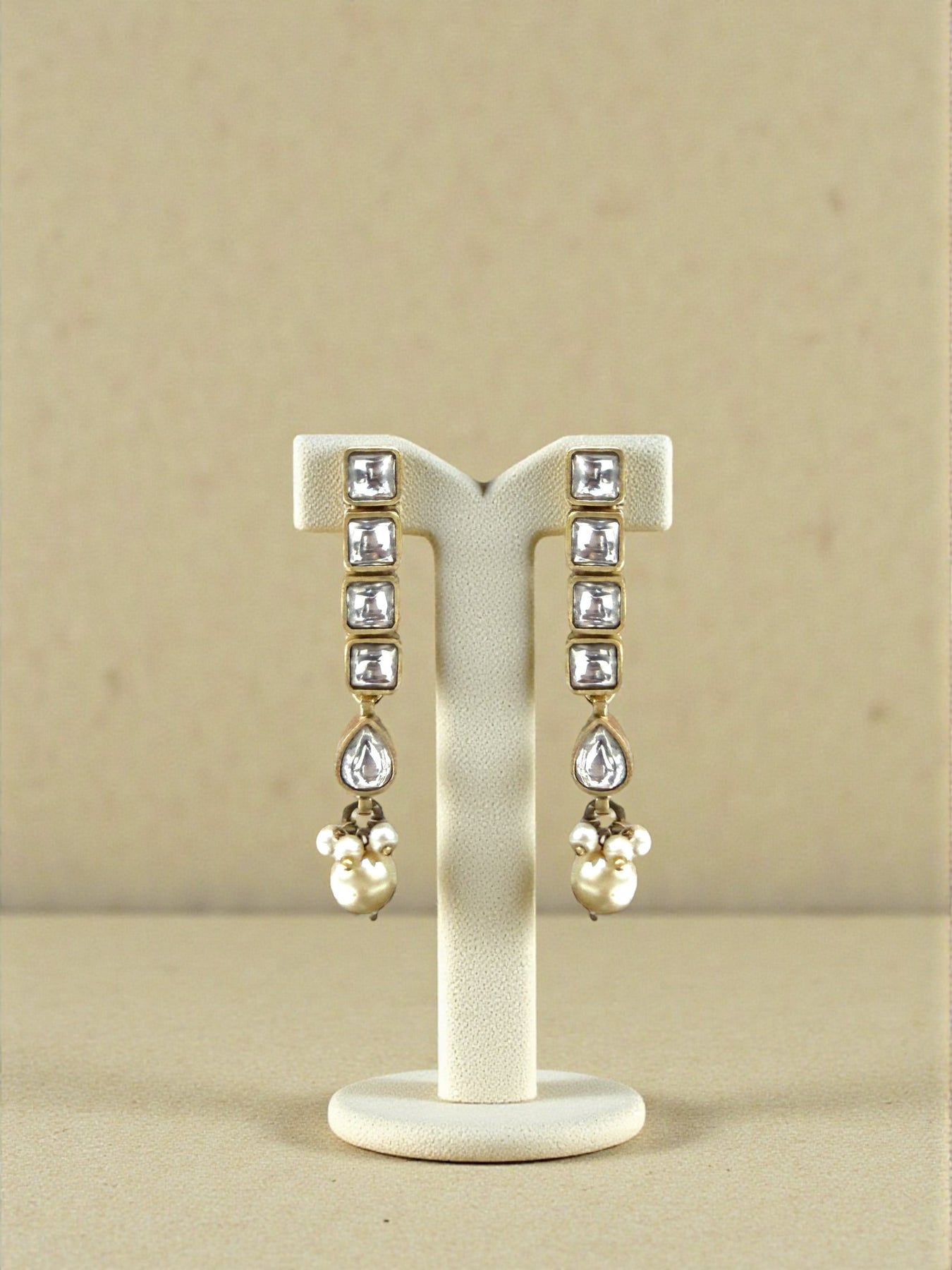 A grand statement choker crafted in shimmering moissanite polki stones, set in a rich gold-tone finish. The intricate square grid pattern is beautifully enhanced with pear-shaped polki drops and delicate pearl bunch detailing, creating a royal and timeless appeal. Perfect for weddings, bridal wear, and festive occasions, this masterpiece blends traditional heritage with contemporary elegance.