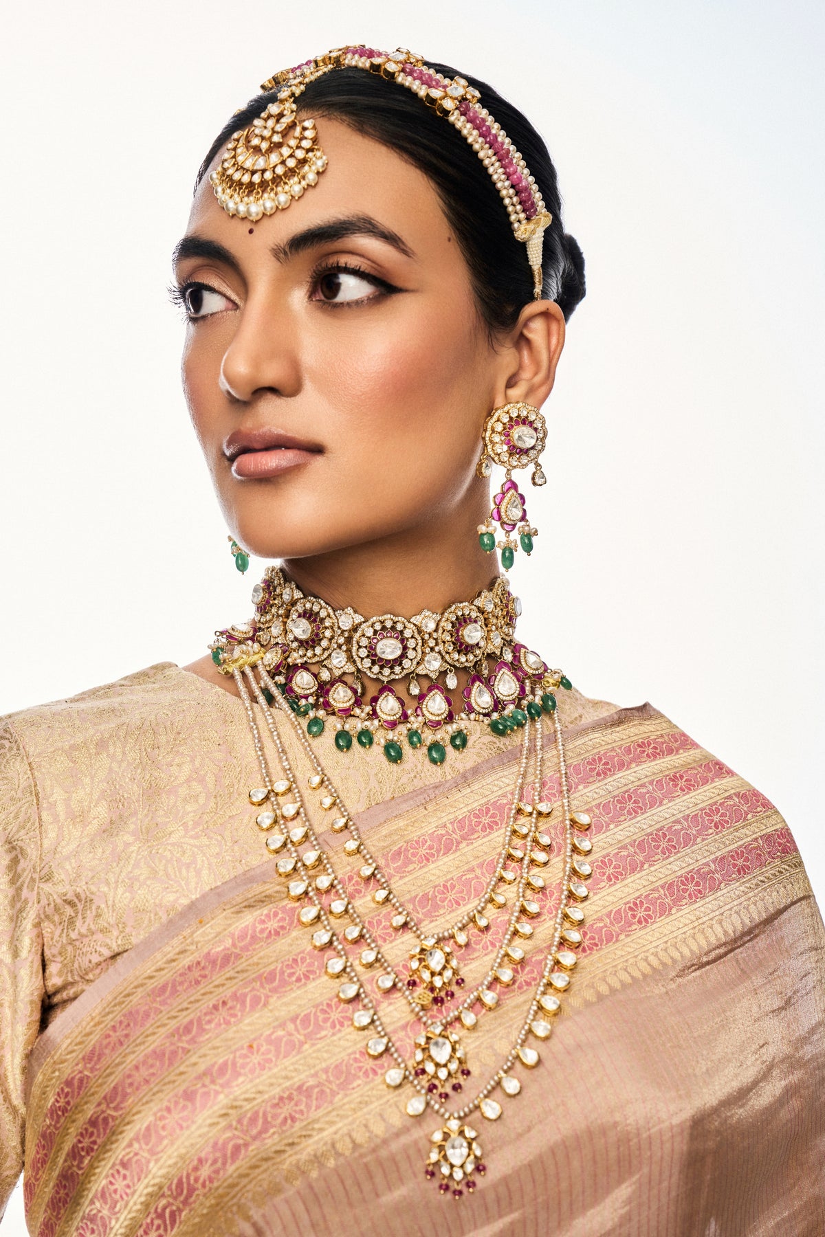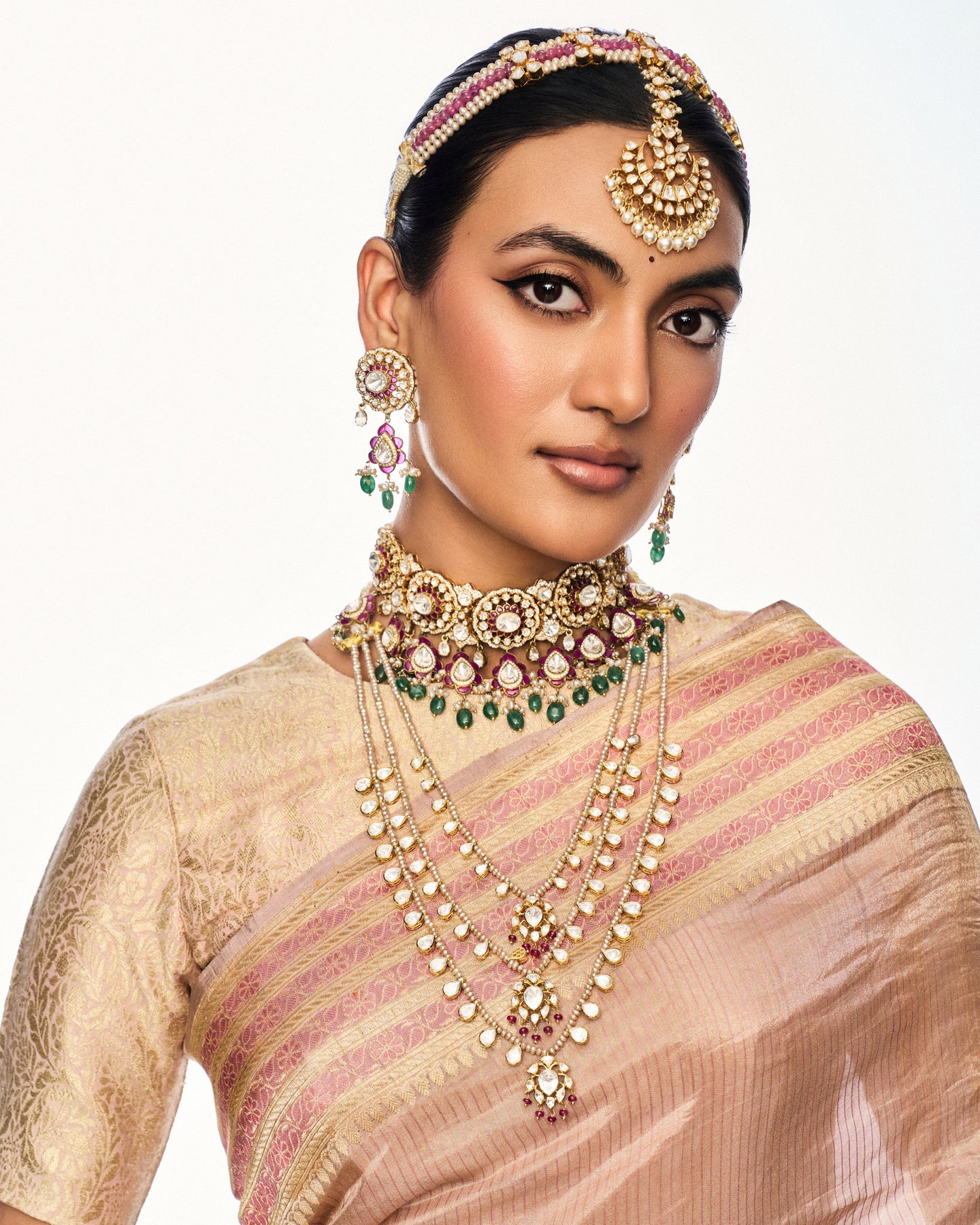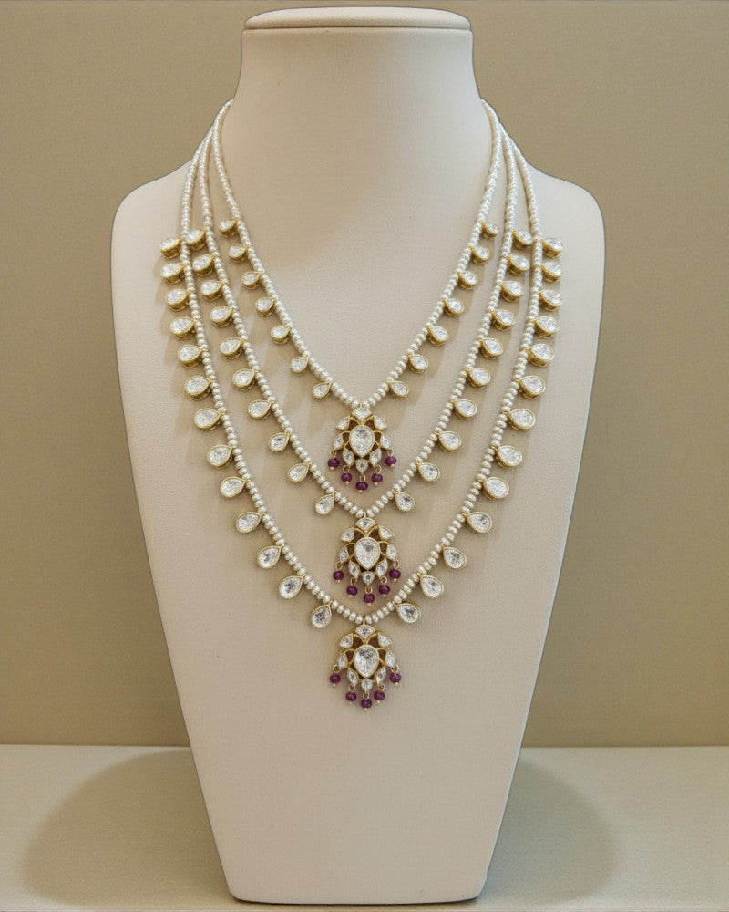 Experience timeless royalty with this exquisite handcrafted necklace made in pure 92.5 sterling silver, elegantly finished with 22-carat gold plating. The design features shimmering moissanite polki stones set in a traditional Kundan inspired style, paired with delicate pearl strands for a graceful layered look.