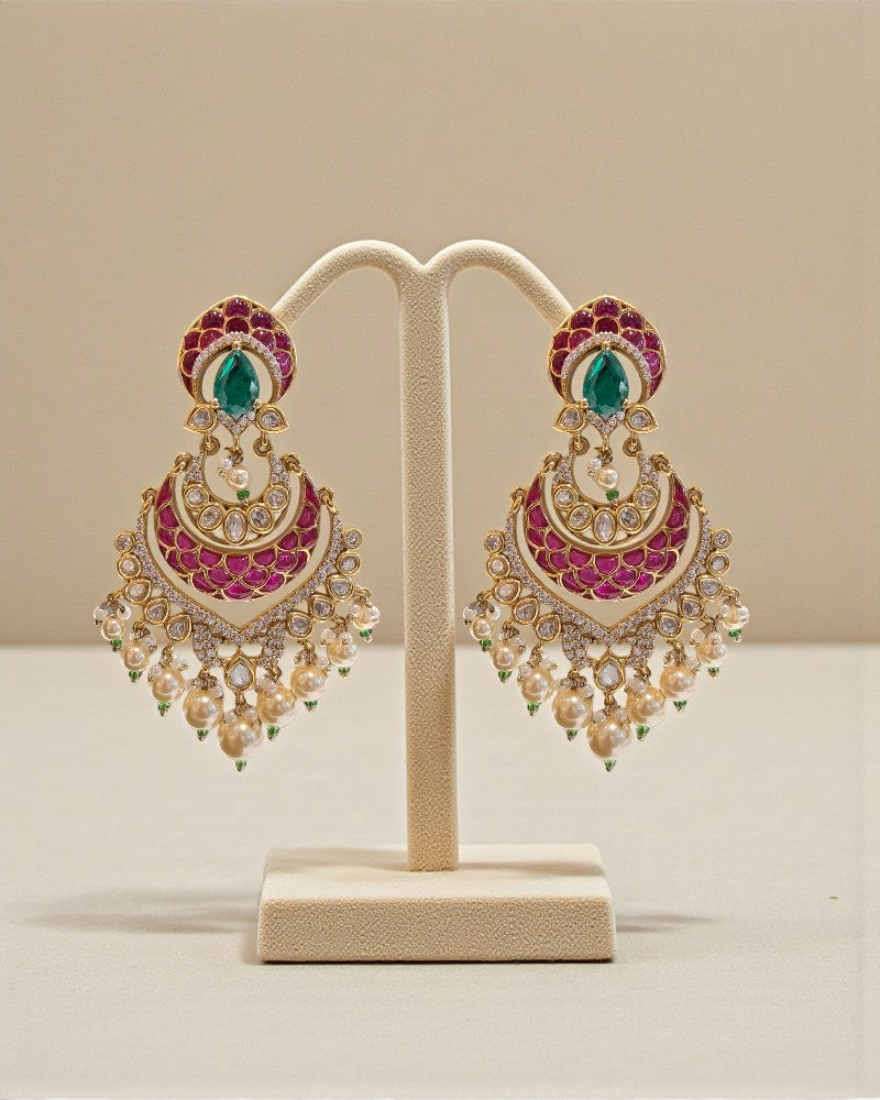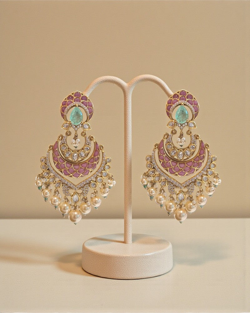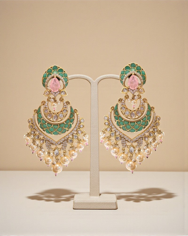 These exquisite chandbali earrings showcase a regal blend of richRed/Mint Green/ Pink enamel work and a striking emerald/pink/mint green center stone, beautifully framed with polki style accents. Finished with delicate pearl drops and intricate gold detailing, they reflect timeless royal elegance. Perfect for bridal wear, festive celebrations, and traditional occasions, these earrings add a graceful statement and luxurious charm to any ethnic ensemble.