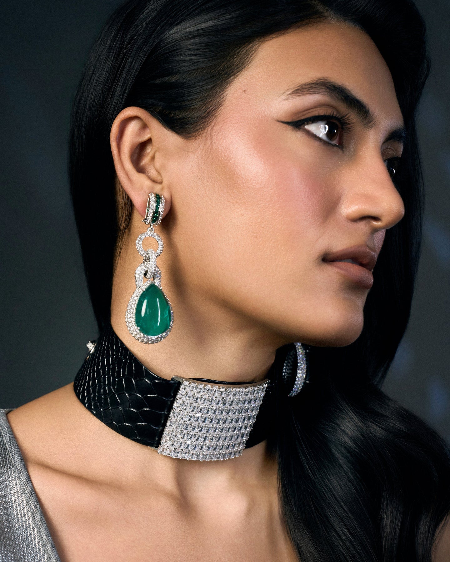 These bold statement earrings feature rich Ruby/Emerald/White toned stones set in an elegant drop silhouette with intricate detailing. Designed to exude power and sophistication, they add a dramatic yet refined touch to evening wear and couture styling.