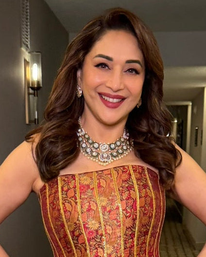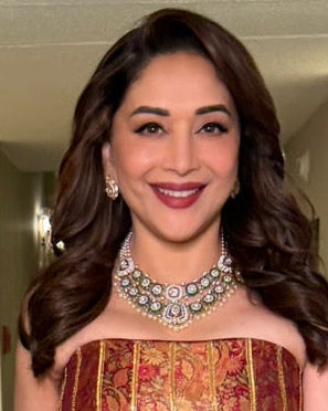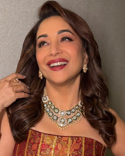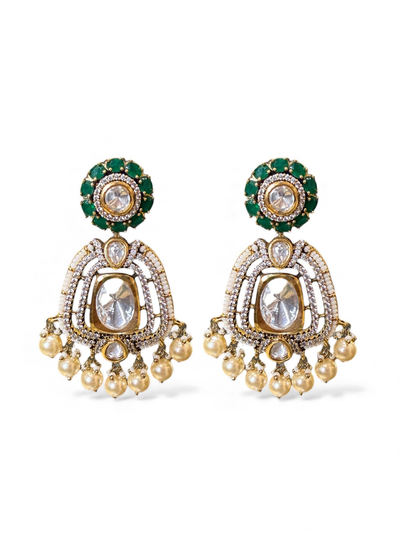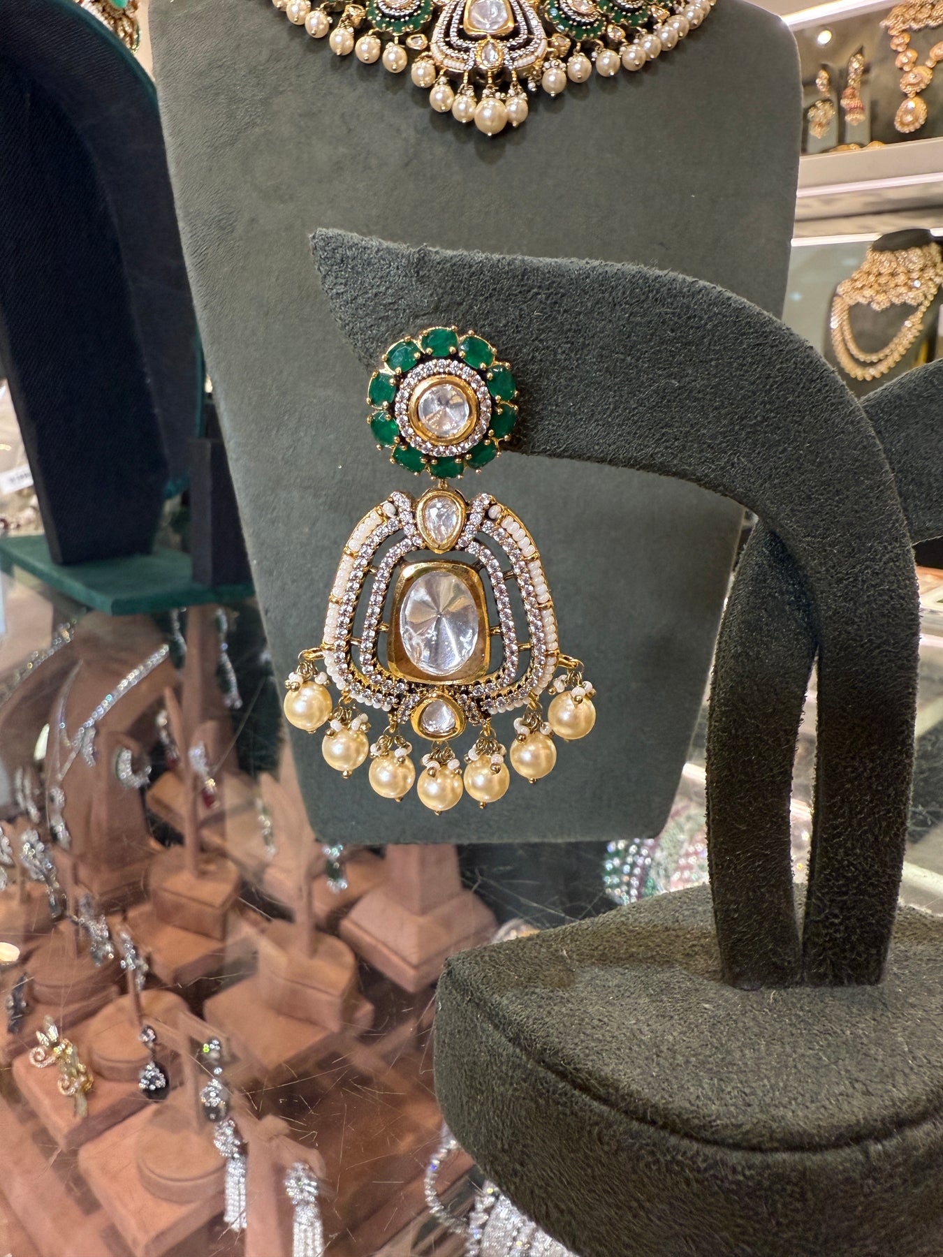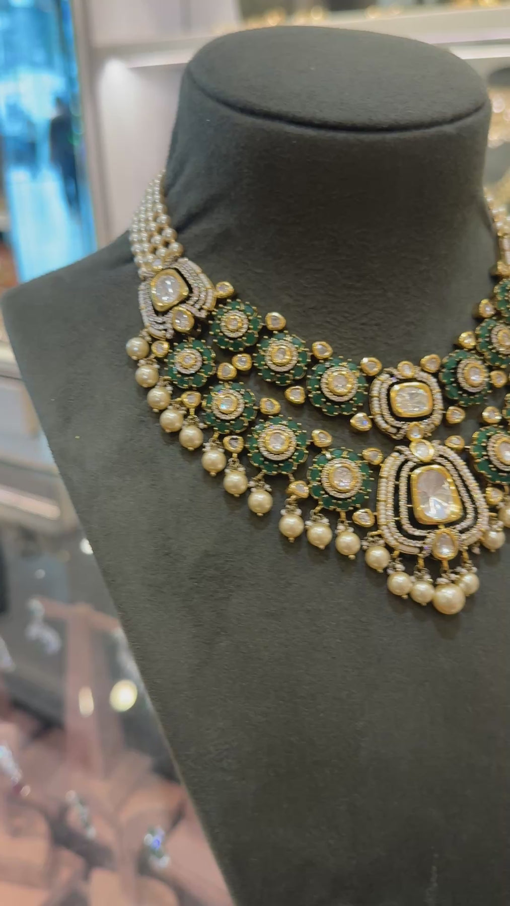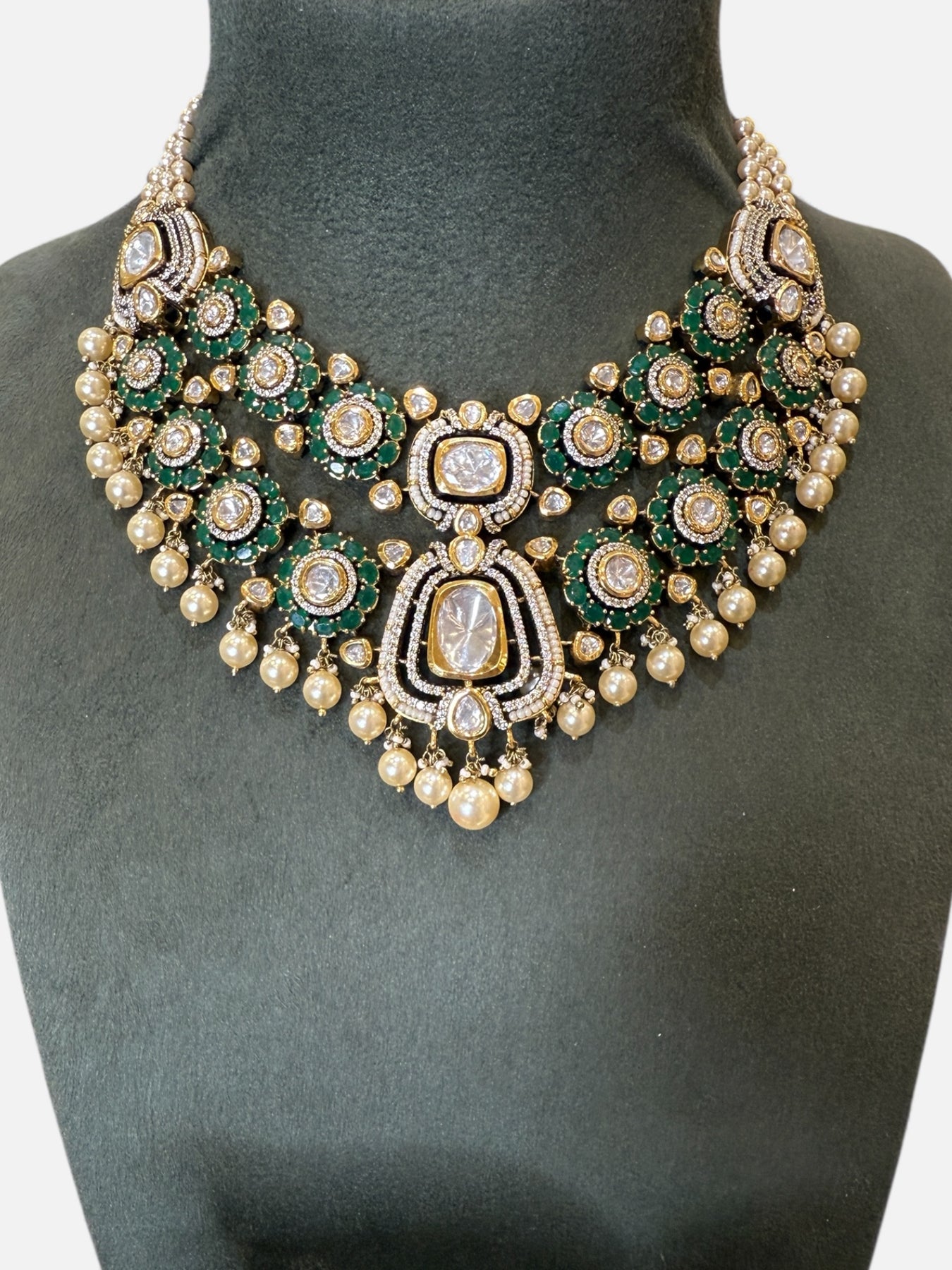 A grand designer necklace crafted in silver with alloy base, embellished with shimmering moissanite polki stones set in intricate floral clusters. Rich emerald green accents elevate the regal charm, while the layered pearl drops add a touch of classic elegance. Finished with anti tarnish coating, this luxurious statement piece is perfect for weddings, festive events, and bridal ensembles that demand unmatched grace and shine.