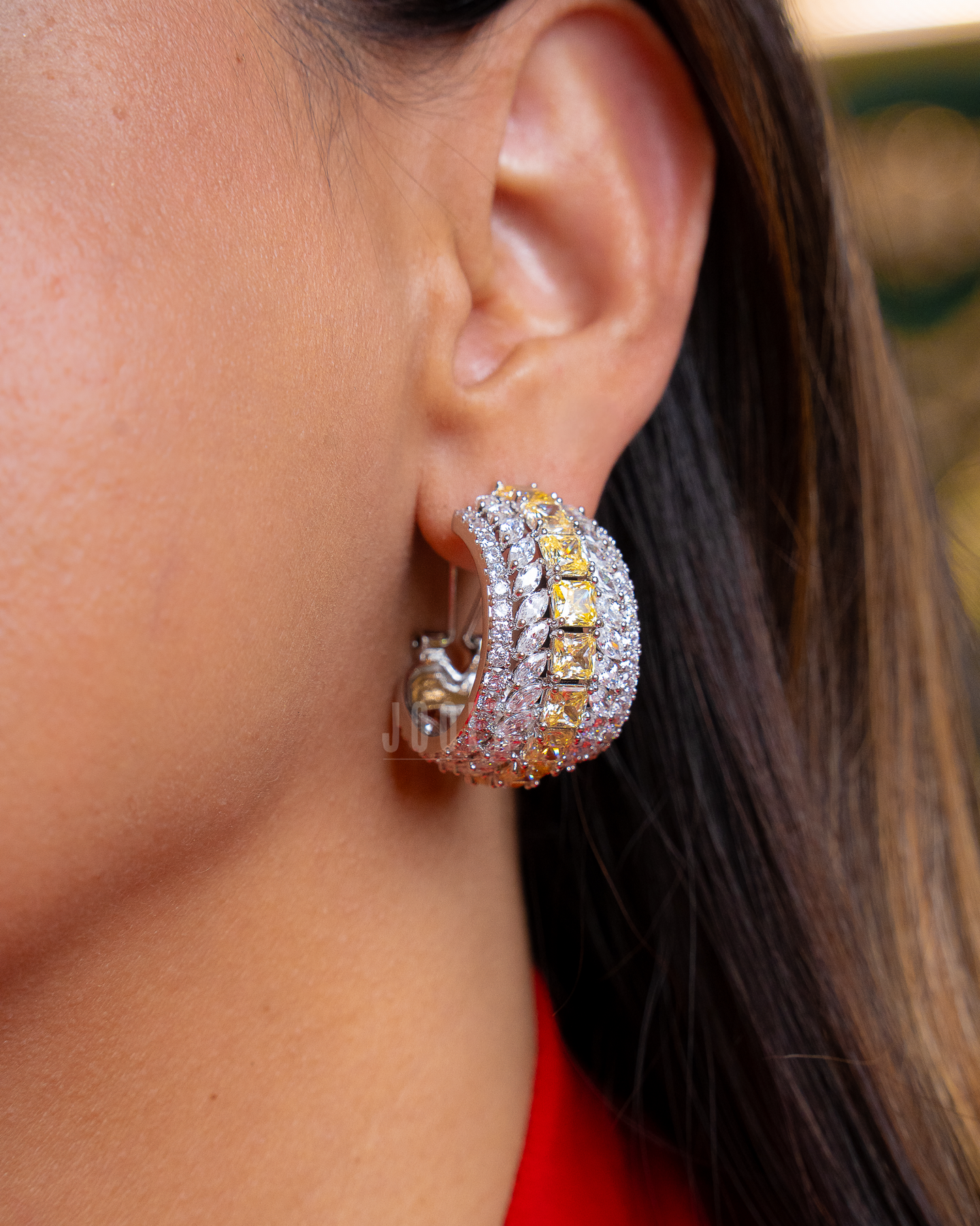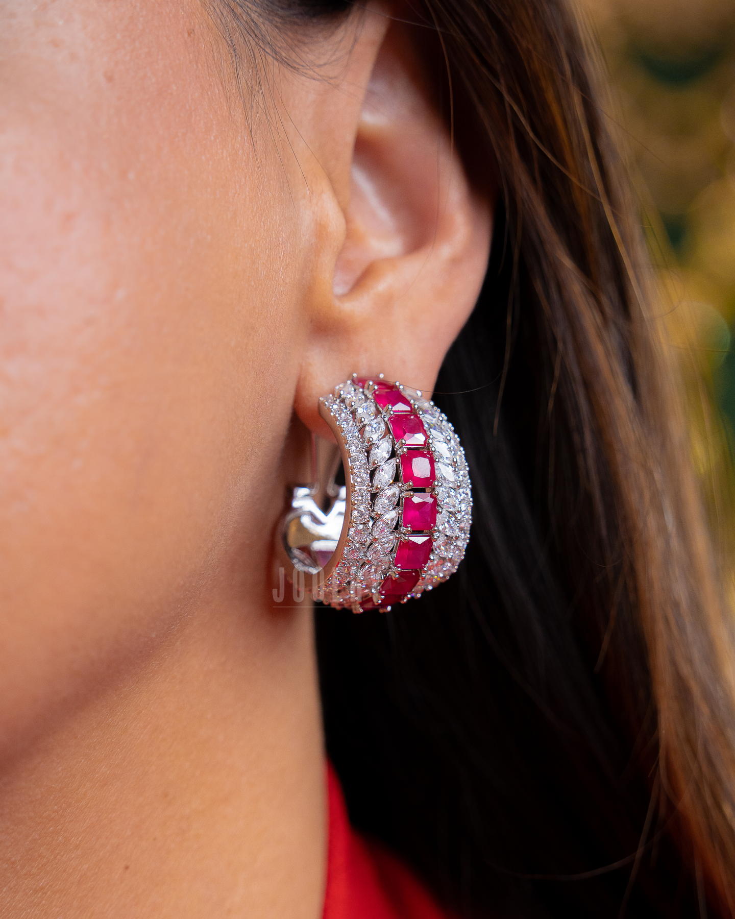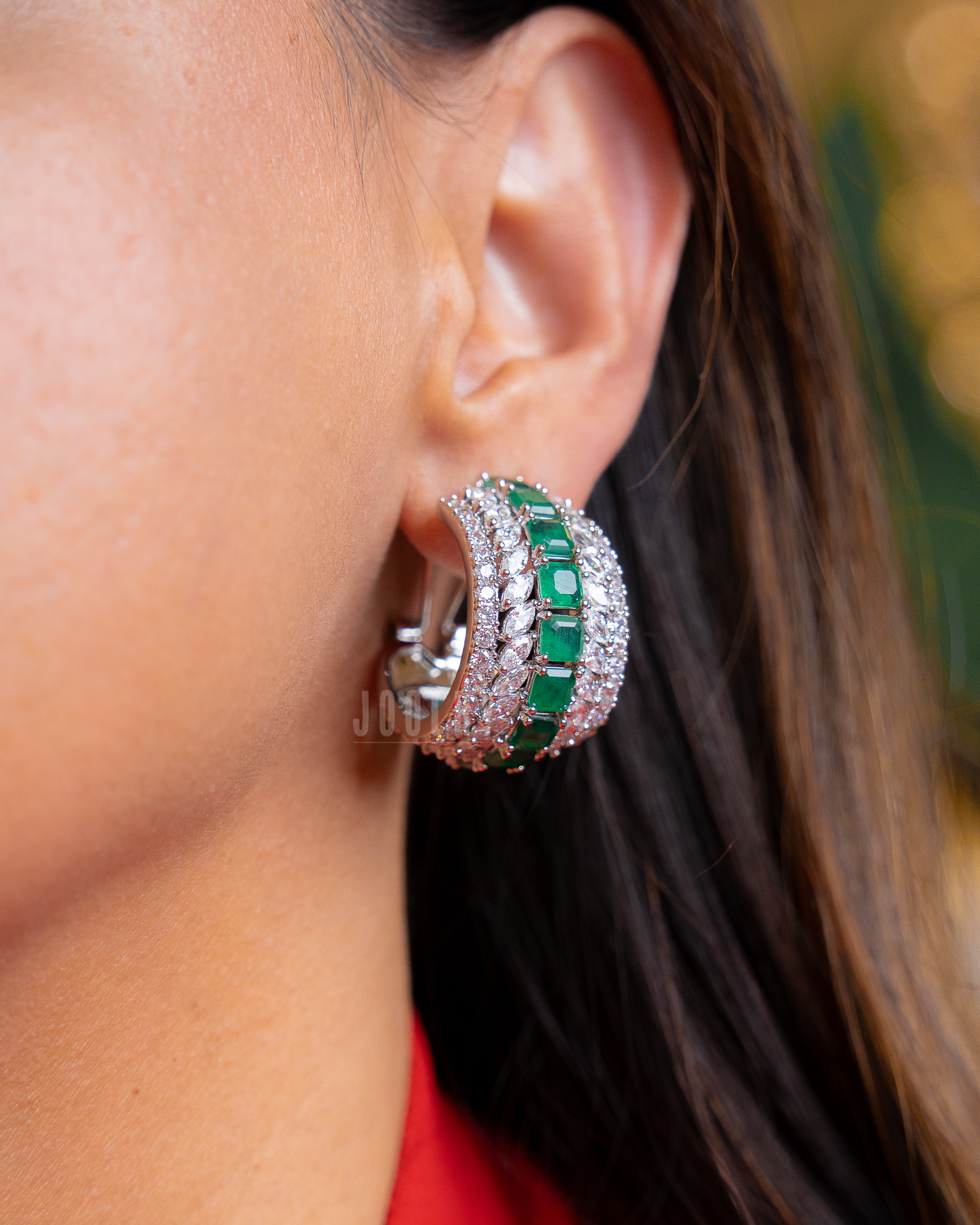 Elevate your elegance with these stunning emerald green/red/yellow stone studded hoop earrings, crafted to make a bold yet graceful statement. Featuring a central row of rich rectangular-cut stones, beautifully framed by layers of shimmering white crystals, these earrings offer a luxurious, high shine finish. The curved hoop design hugs the ear perfectly, adding depth and brilliance from every angle. Ideal for festive occasions, weddings, and evening wear, this piece blends classic charm with modern sophistication.