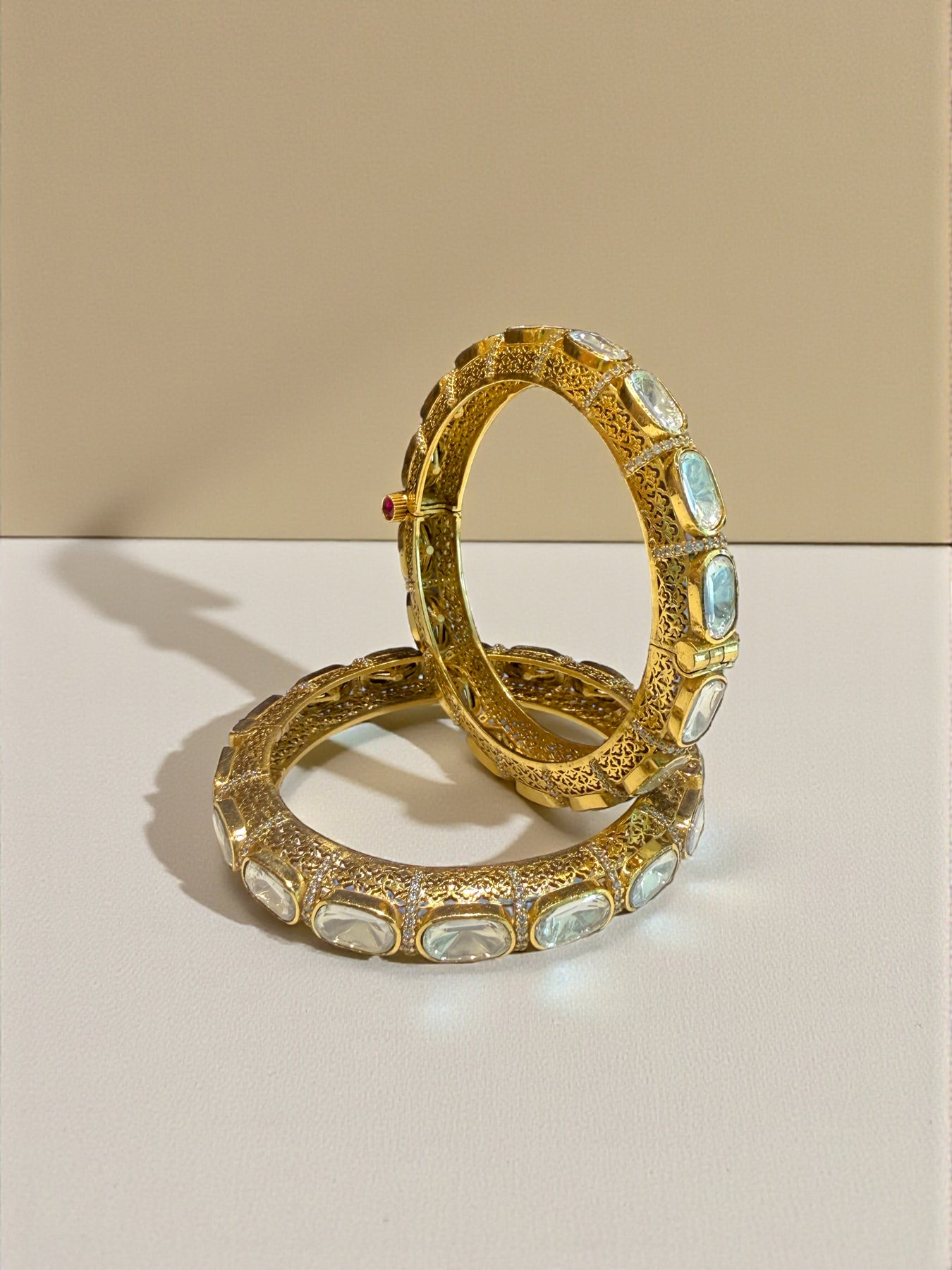 An opulent kada crafted with radiant oval kundan stones and detailed antique gold filigree. The structured silhouette and intricate inner work reflect royal craftsmanship, making it ideal for bridal and grand festive wear.