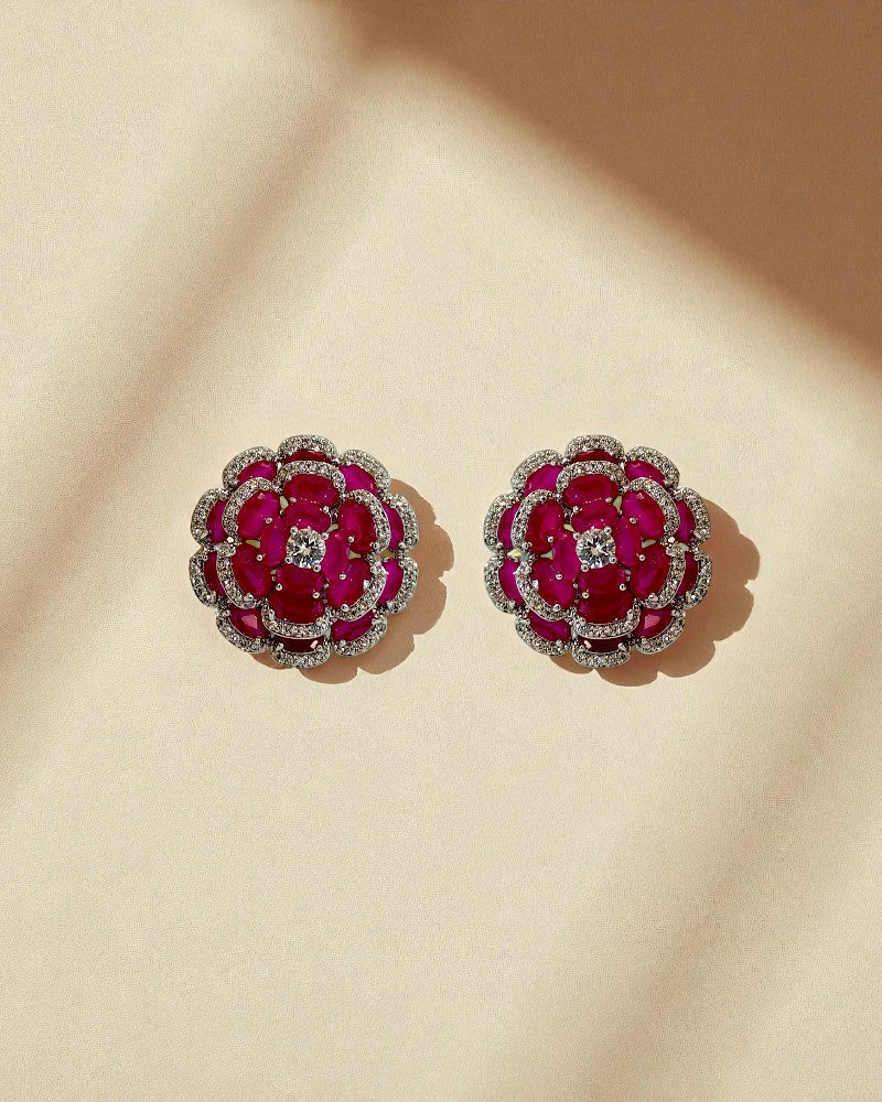 A stunning statement necklace crafted with bold pink floral motifs, each flower brought to life with shimmering stones set in silver with alloy. The intricate double-layered petals add richness and depth, while the anti-tarnish finish ensures long-lasting shine. Perfect for weddings, festive looks, or any moment where you want your style to bloom with brilliance.
