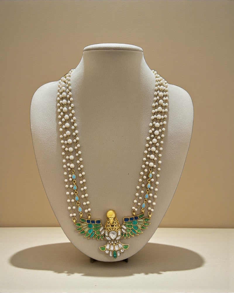 A stunning handcrafted pearl mala featuring a regal bird-inspired pendant, beautifully detailed with green and blue enamel work and kundan-style stones. The multi-layered pearl strands add a royal and traditional charm, making it perfect for weddings, festive occasions, and ethnic wear. This statement piece blends classic temple jewellery aesthetics with elegant craftsmanship, ideal for brides and traditional jewellery lovers.