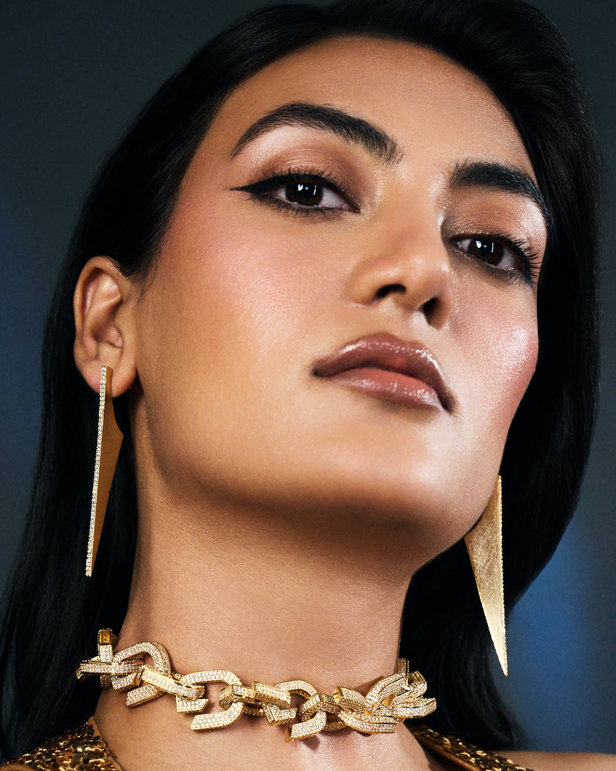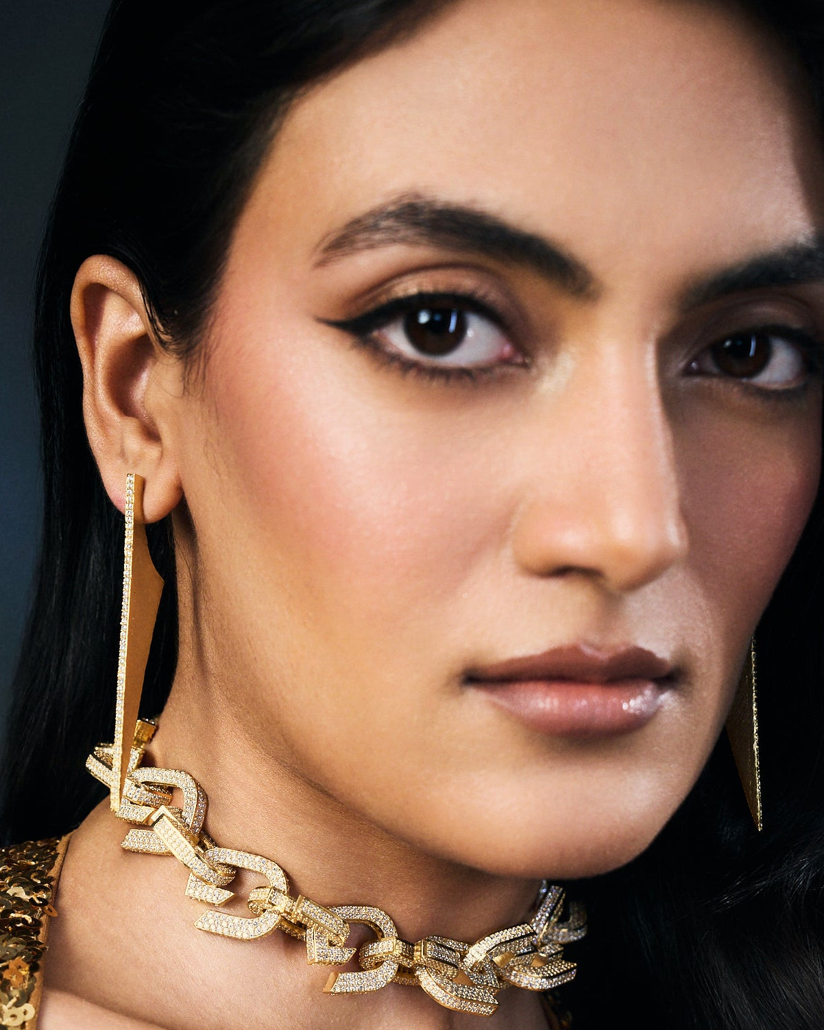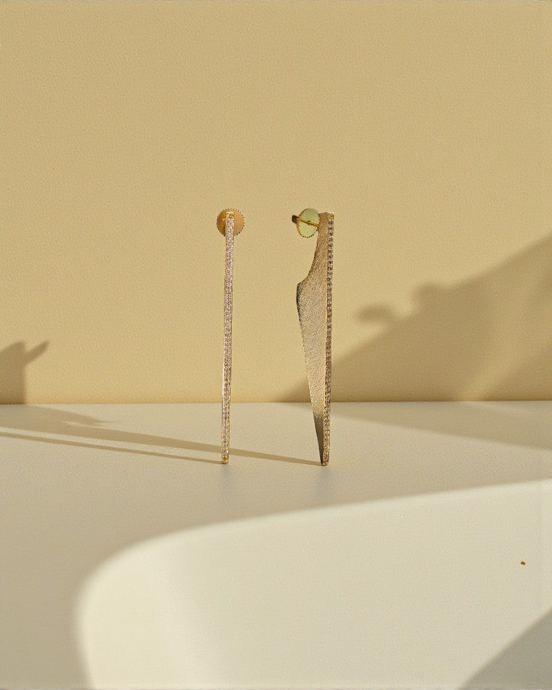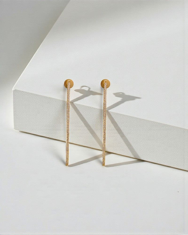 Sleek and elegant drop earrings designed with a slim vertical silhouette, highlighted by sparkling stones for a refined shine. Lightweight and modern, these earrings add effortless grace to both festive and evening looks. Perfect for those who love minimal yet statement jewellery.