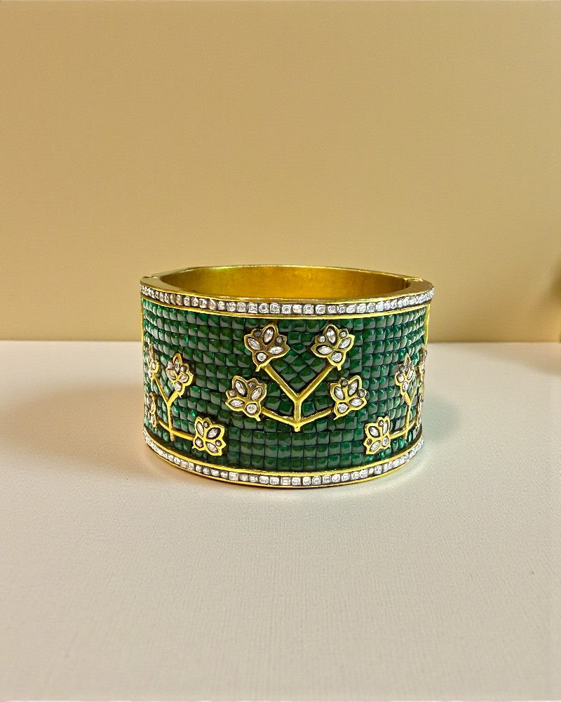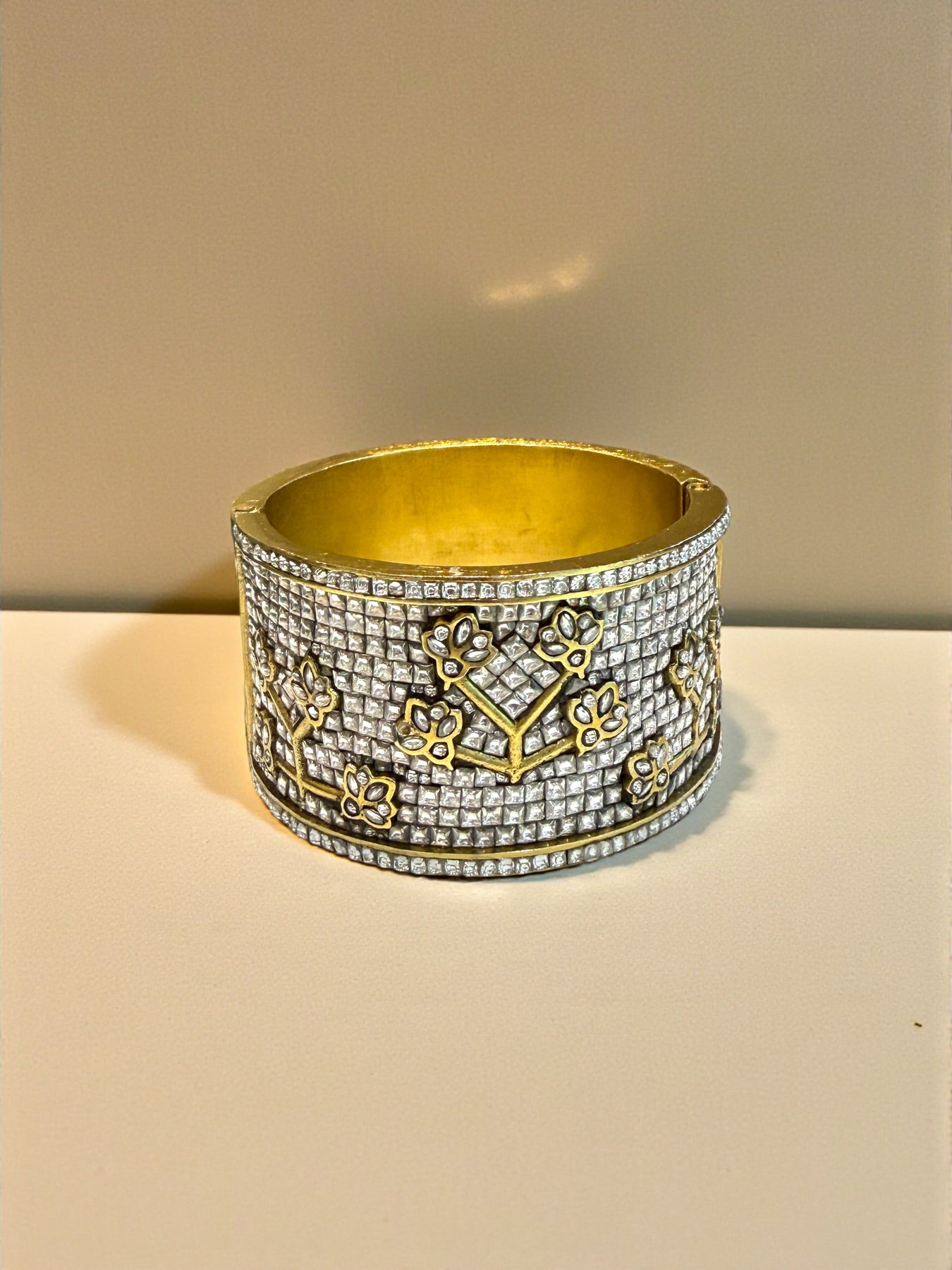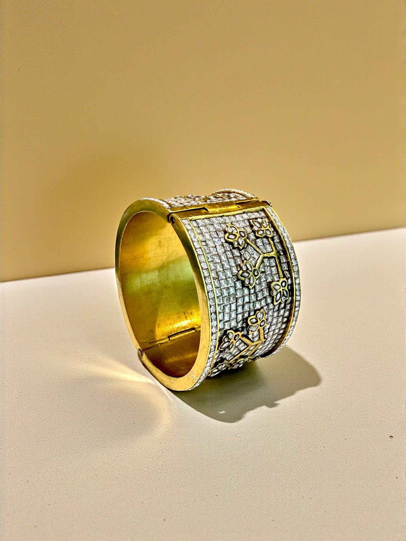 A regal handcrafted cuff inspired by royal Indian artistry. Intricate floral motifs in antique gold gracefully sit over a textured silver toned surface, creating a rich contrast. Finished with a smooth gold interior, this statement bangle blends heritage charm with timeless elegance perfect for festive wear and traditional ensembles.