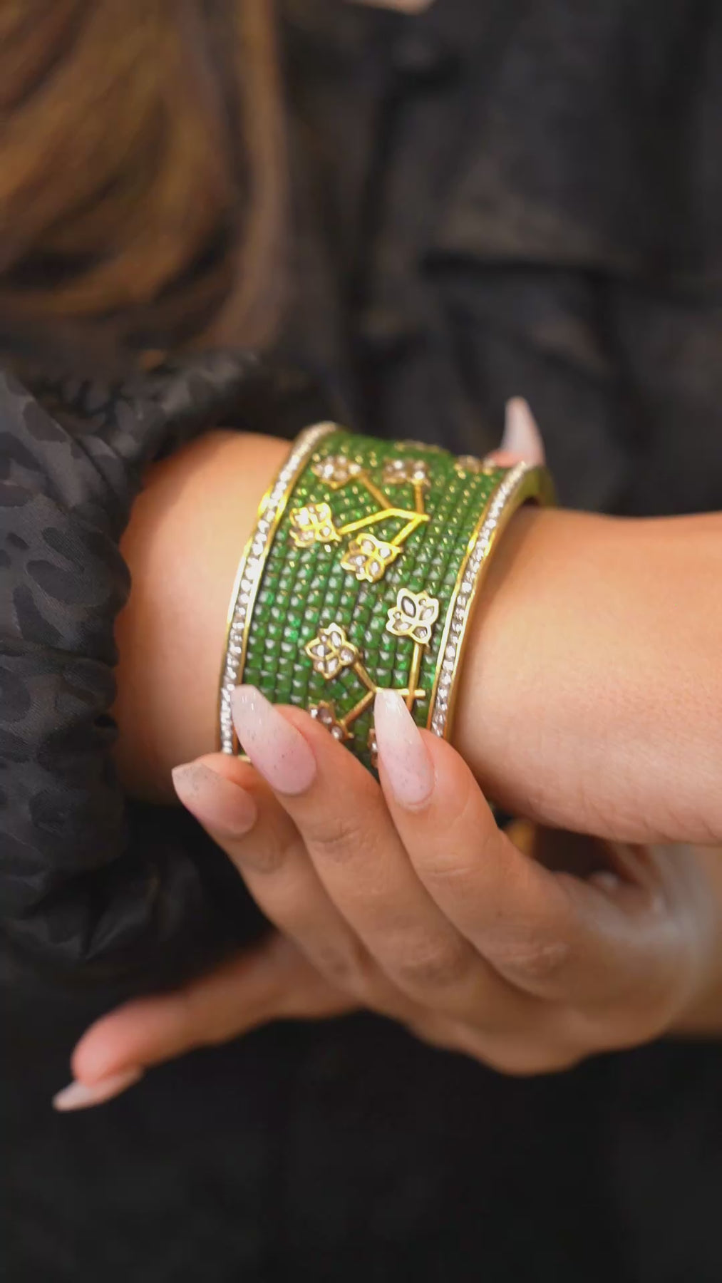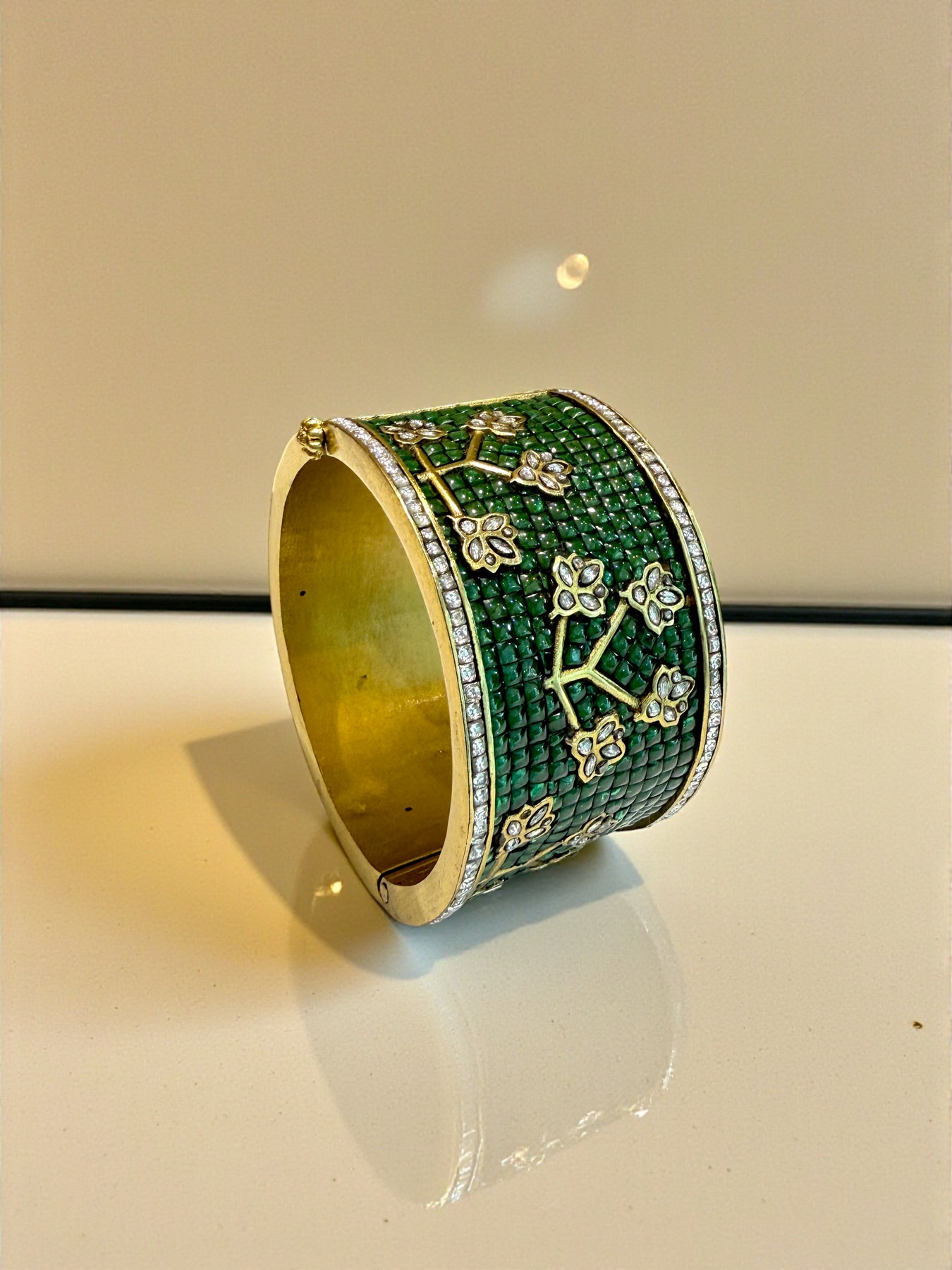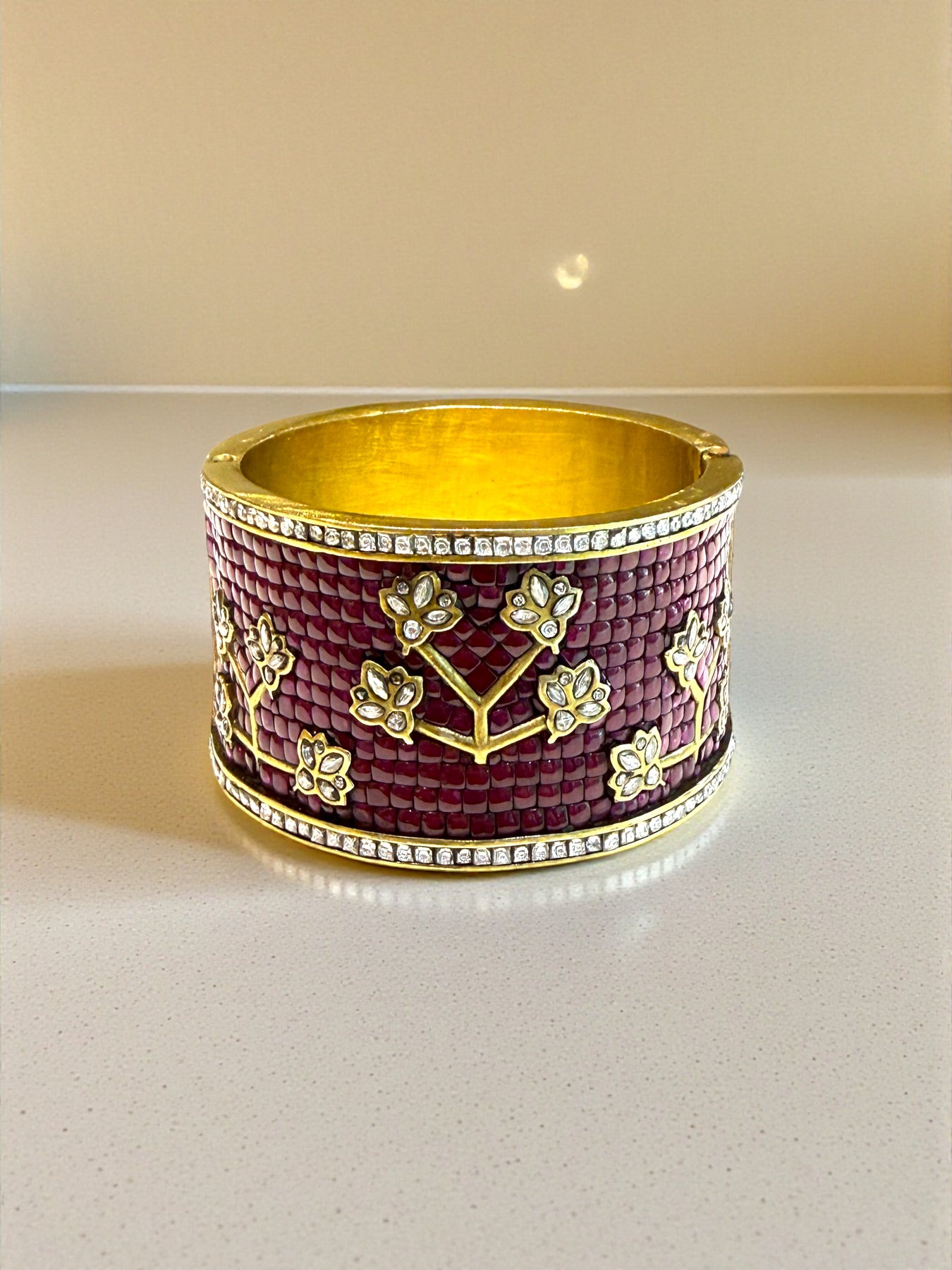 A regal handcrafted cuff inspired by royal Indian artistry. Intricate floral motifs in antique gold gracefully sit over a textured silver toned surface, creating a rich contrast. Finished with a smooth gold interior, this statement bangle blends heritage charm with timeless elegance perfect for festive wear and traditional ensembles.