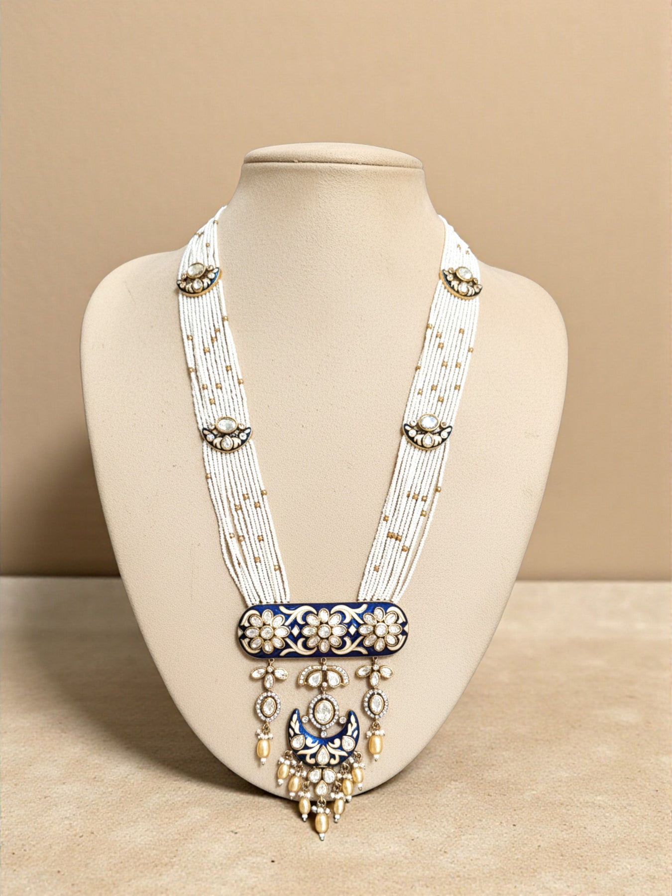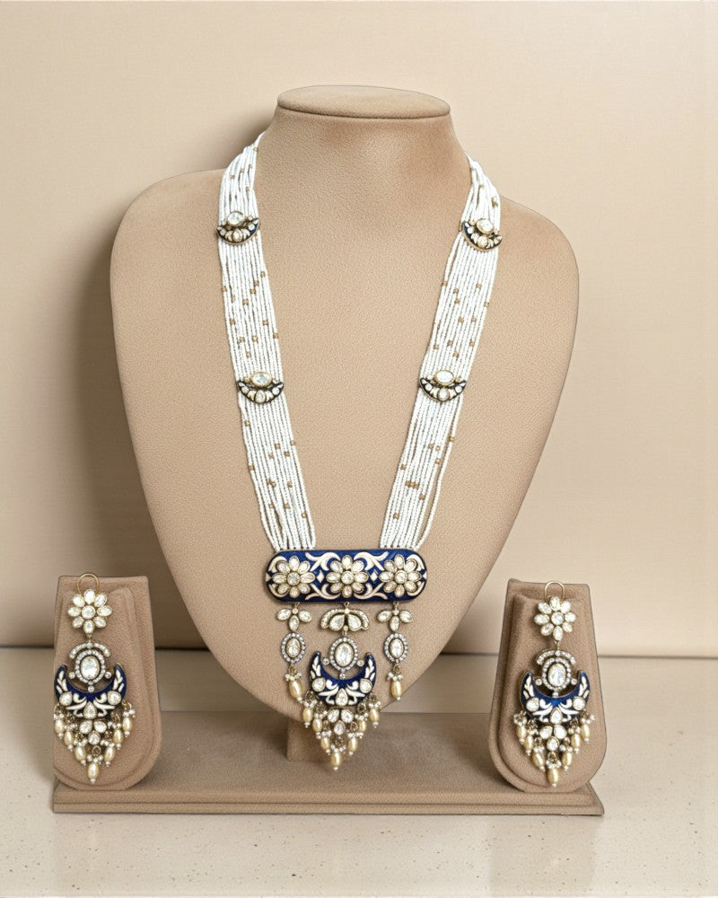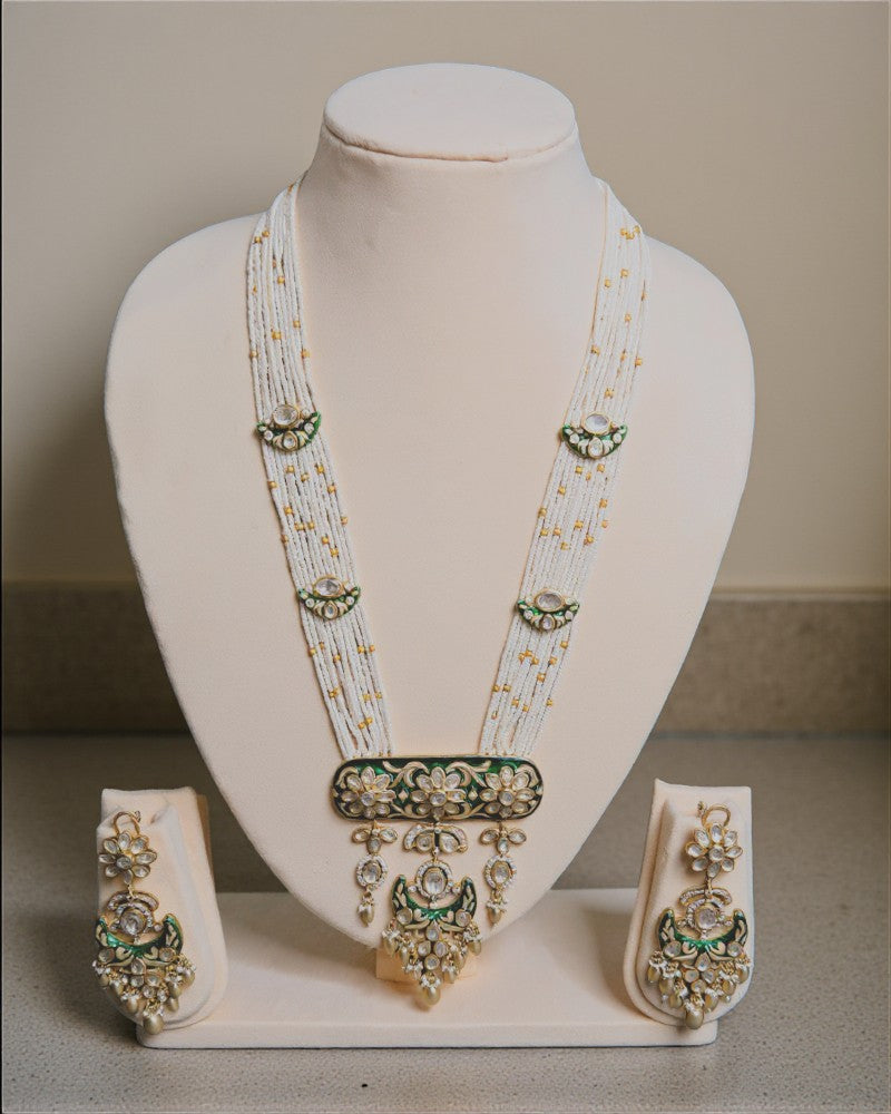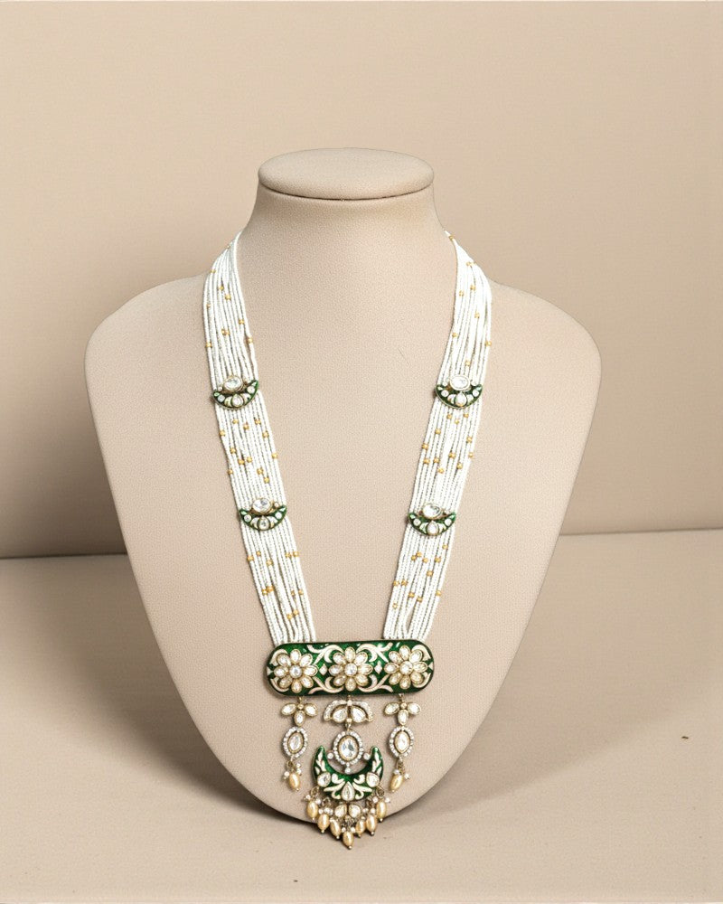 A graceful long necklace set crafted with delicate multi-layered pearl strings, highlighted by intricate polki motifs and rich green meenakari enamel work. The statement pendant features floral artistry with dangling pearl drops, giving it a royal yet soft traditional charm. Paired with matching chandelier earrings, this set is perfect for weddings, festive occasions, and bridal trousseau styling.