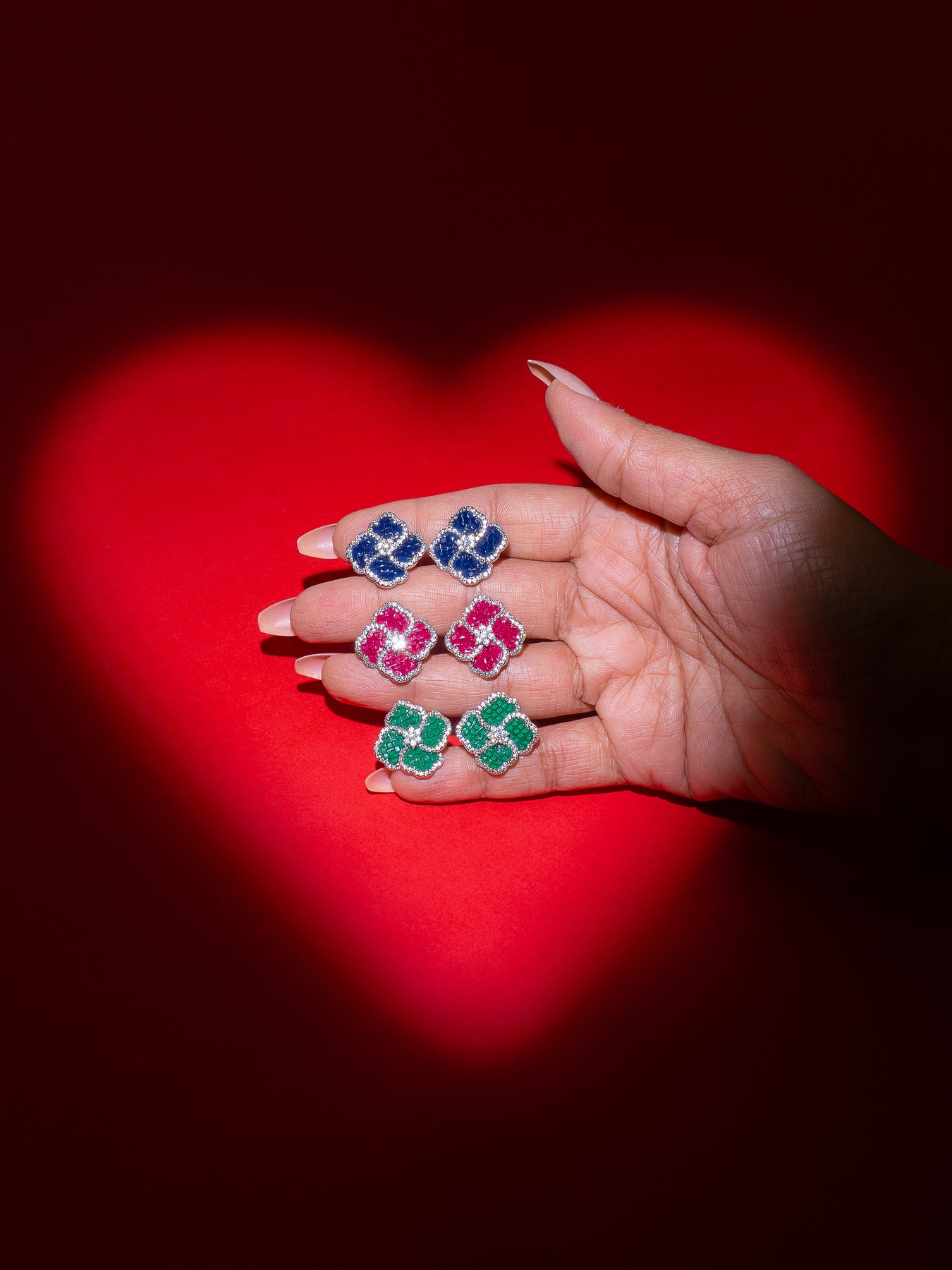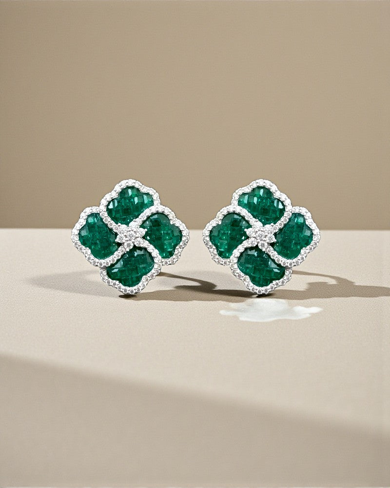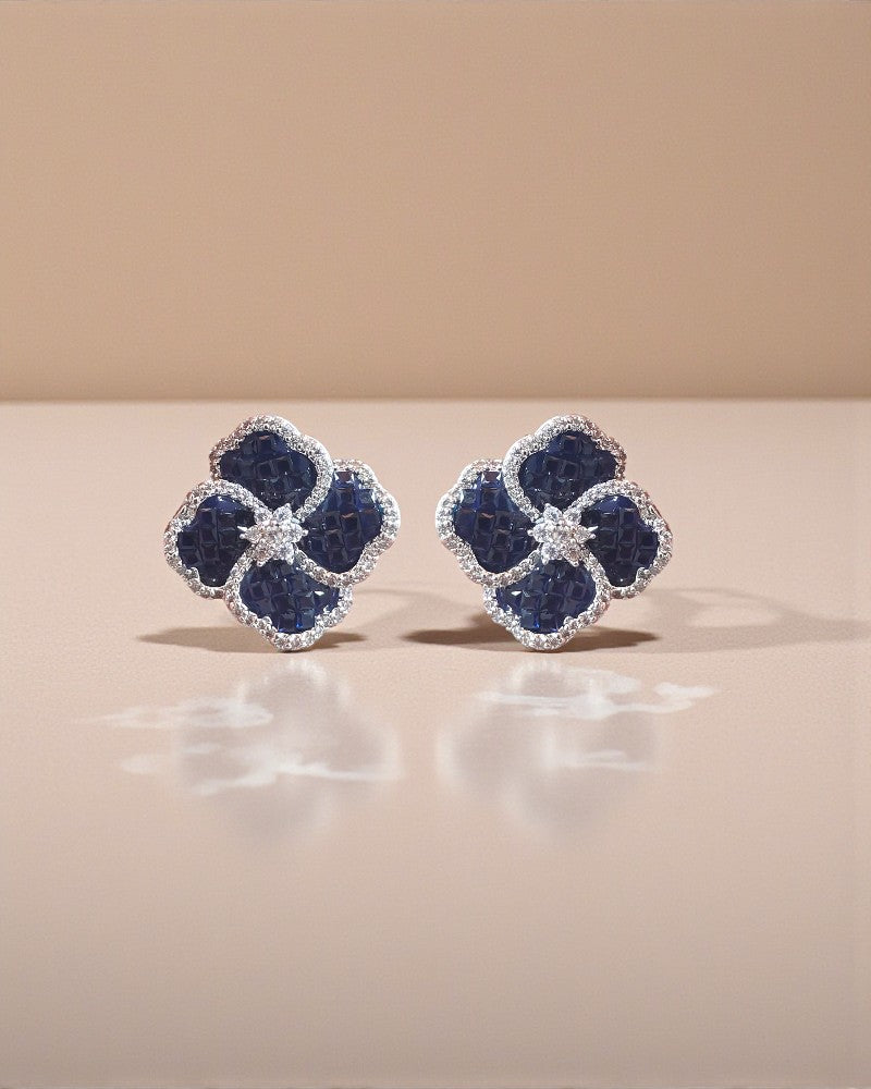 Elegant clover shaped stud earrings adorned with shimmering stones, designed to add a touch of luxury to your everyday and festive looks. Available in rich blue, ruby pink, and emerald green, each pair is delicately outlined with sparkling accents for a refined finish. Lightweight, timeless, and effortlessly chic perfect for gifting or elevating your own jewelry collection.