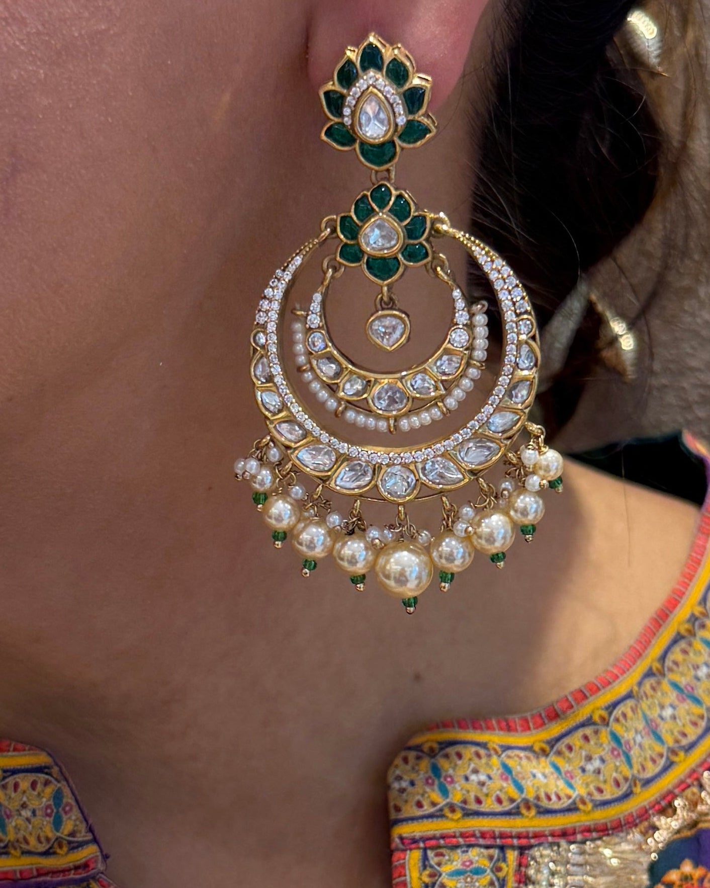Crafted with precision, the Vidya Chandbali showcases a harmonious blend of silver with green and red alloy accents. Designed to resist tarnishing, this elegant piece maintains its vibrant luster over time, offering both durability and timeless style. Perfect for adding a refined yet colorful touch to your ensemble.